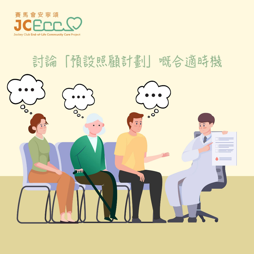 「預設照顧計劃」對有嚴重病患的人士來說尤其重要,是讓病人、家人與醫護人員一起商討,當病人日後在病危時希望得到什麼的治療及照顧。在討論過程裡面,醫護人員會向病人及家人了解及確認病人的心願和照顧意願,還會提供專業意見,根據病人的最佳利益,一起謀求共識,為病人制定合適的晚期醫療及個人照顧計劃。至於何時是討論「預設照顧計劃」的合適時機?可以參考以下的建議:…